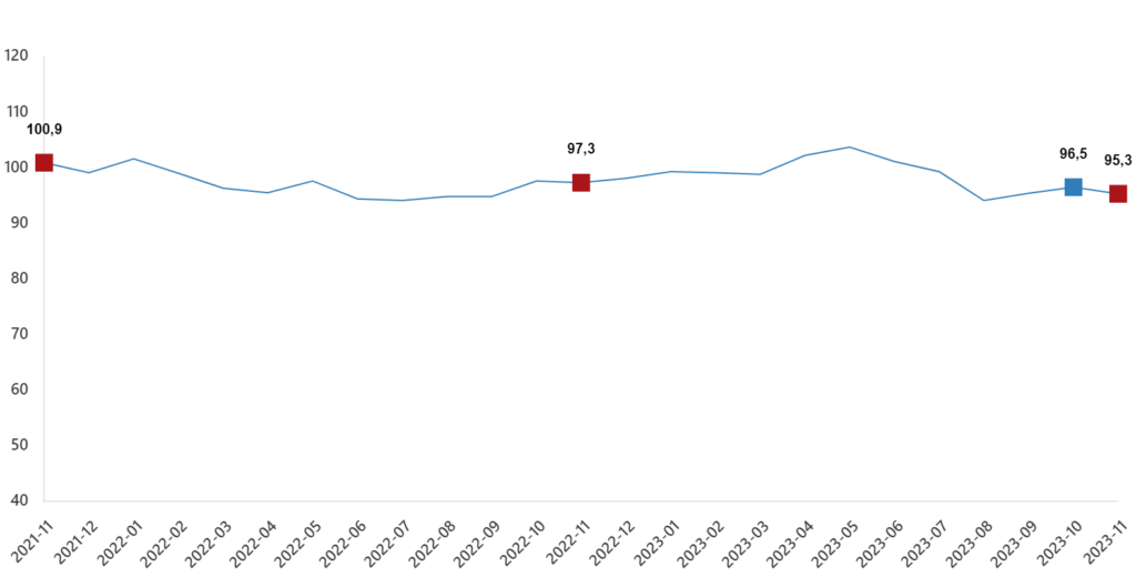 Mayıs ayında 103.3 bandını aşarak iyimserliği yakalayan ekonomik güven endeksi, seçimden sonra sürekli düşerek 6 aydır bu seviyeyi bir daha yakalayamadı. Kasımda endeks yüzde 1,3 düşüşle 95.3'e indi.