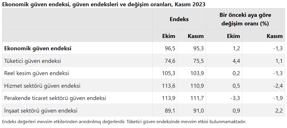 Bir önceki aya göre kasım ayında tüketici güven endeksi yüzde 1,1 oranında artarak 75,5 değerini, reel kesim (imalat sanayii) güven endeksi yüzde 1,3 oranında azalarak 103,9 değerini aldı.