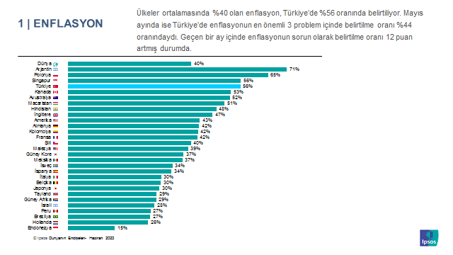 Ankete katılanların enflasyon, işsizlik ve yaşam standardı gibi konulardaki beklentilerinde de seçimler sonrası ciddi bozulma görülüyor. Enflasyon tüm ülkeler ortalamasında yüzde 40 ile ilk üç büyük sorun arasında gösteriliyor. Ancak Türkiye’de enflasyonu en önemli 3 sorun arasında belirtenlerin oranı mayısta yani seçimlerin yapıldığı ayda yüzde 44 iken haziranda 12 puan artarak yüzde 56’ya yükselmiş. Enflasyonu en önemli 3 sorun arasında gösterenlerin oranının Türkiye’den fazla olduğu ülkeler ise yüzde 71 ile Arjantin, yüzde 65 ile Polonya ve yüzde 56 ile Singapur.