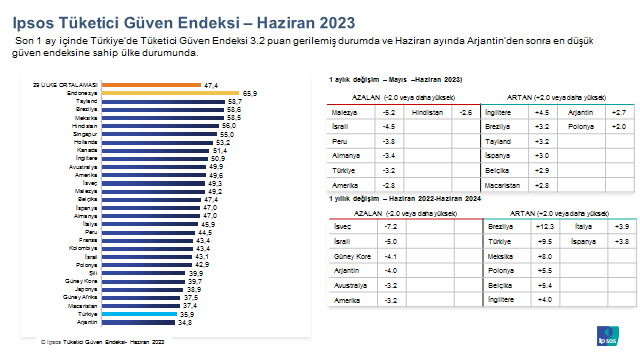 Seçimler Türkiye’de Ipsos Tüketici Güven Endeksi’ni de vurmuş. Ipsos Tüketici Güven Endeksi’ne göre Türkiye’nin Güven Endeksi de mayısta bir önceki aya göre 3.2 puanlık düşüşle 35.9’a gerilemiş ve araştırmaya katılan ülkeler arasında yüzde 100’ü geçen enflasyona sahip 3 ülke Arjantin’in ardından ikinci sırada yer alıyor. Araştırmaya katılan 29 ülkenin güven ortalaması 47,4 iken, güveni en yüksek tüketiciler ise 65.9 puan ile Endonezyalılar. Arjantin’in tüketici güven endeksi ise yüzde 34,8.