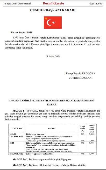 Resmi Gazete'de yayınlanan kararla sigara ve purolarda uygulanan nispi ÖTV oranı yüzde 57'den yüzde 53,5'e indirildi, paket başına alınan maktu vergi tutarı 5,7424 liradan 7,8 liraya çıkarıldı.