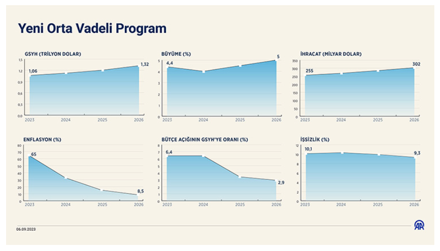 3 yılı kapsayan Orta Vadeli Program kapsamında ekonominin 2024’te yüzde 4, 2025’te yüzde 4,5, 2026’da yüzde 5 büyüyeceği öngörüldü. Enflasyonun enflasyon hedefi 2024 yılı için yüzde 33, 2025 için yüzde 15,2, 2026 için yüzde 8,5 olarak belirlendi. Bütçe açığının gayrisafi yurt içi hasılaya oranının 2024’te yüzde 6,4, program dönemi sonunda ise yüzde 2,9 olarak gerçekleşeceği öngörüldü.