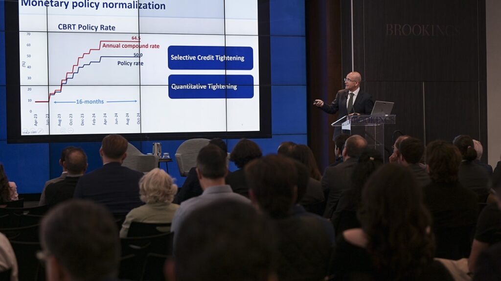 Şimşek bakanlığının bütçesinin sunumunda yaptığı konuşmada "Yönetilen ve yönlendirilen fiyatları enflasyon hedefiyle bütçe imkanlarının elverdiği ölçüde uyumlu olarak belirleyeceğiz" dedi. Hazine ve Maliye Bakanı Mehmet Şimşek IMF ve Dünya Bankası toplantılarına katılmak için bulunduğu ABD’de Brookings Enstitüsü’nde düzenlenen etkinlikte Türkiye’nin ekonomik görünümüne ilişkin detaylı bir sunum yaptı. Türkiye’de güçlü bir üretim kültürü olduğuna dikkat çeken Şimşek “Peki neden bazı gelişmiş ekonomiler kadar zengin değiliz? Çünkü hâlâ katma değer zincirinde yukarı çıkamadık. Bu üzerinde çalışmamız gereken bir konu. Orta yüksek ve yüksek katma değerli ürünler üretmek için yapısal reformlara hız kazandıracağız” dedi.