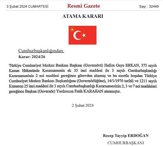 Resmi Gazete’de yayınlanan atama kararında Hafize Gaye Erkan’ın söylediği gibi görevinden ayrılmadığı, alındığı belirtildi.
