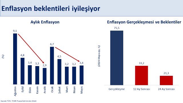 Dezenflasyon süreci başlıyor: Yıllık enflasyonda en yüksek seviye geride kaldı. Enflasyonda belirgin ve kalıcı düşüş dönemine giriyoruz. Piyasanın 12 ay sonrası enflasyon beklentisi yüzde 33,2, 24 ay sonrası beklentisi yüzde 21,3 seviyesinde.