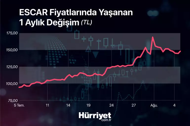 Escar hissesi incelendiğinde 4 Temmuz 2023 tarihinde herhangi bir özel durum olmamasına rağmen hisse yükselişe geçmiş. 4 Temmuz 2023’te 80.95 liradan işleme başlayan hisse 1 Ağustos 2023 tarihinde 174,90 liraya kadar yükselmiş. 1 Ağustos’ta ise kapanışını 153,70 liradan gerçekleştiren Escar hissesi 4 Ağustos 2023 tarihinde 148,80 liraya kadar geriledi. Böylece hisse yaklaşık bir aylık süreçte 4 Temmuz 2023-1 Ağustos 2023 tarihine kadar yüzde 116 oranında yükseliş gerçekleştirmiş.