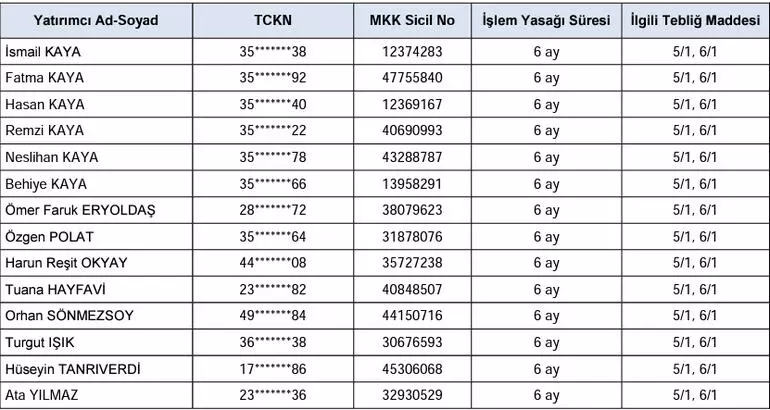 Escar Filo Kiralama Hizmetleri AŞ (ESCAR) pay piyasasında 04.07.2023-01.08.2023 döneminde gerçekleştirilen işlemlerde 6362 sayılı Sermaye Piyasası Kanunu’nun (SPKn) 107/1 maddesinde sayılan fiilin işlendiğine dair makul şüphe bulunması nedeniyle; 6362 sayılı SPKn’nun 1 inci maddesi çerçevesinde yatırımcıların hak ve yararlarının korunmasını teminen, 6362 sayılı SPKn’nun 128/1-(a) maddesine dayanarak yapay piyasa oluşturmaya yönelik işlemlerin engellenmesi amacıyla; 6362 sayılı SPKn’nun 101/1 maddesi ve V-101.1 sayılı Bilgi Suistimali ve Piyasa Dolandırıcılığı İncelemelerinde Uygulanacak Tedbirler Tebliği’nin 5/1 ve 6/1 maddeleri uyarınca; aşağıdaki tabloda bilgilerine yer verilen kişiler hakkında 07.08.2023 tarihli işlemlerden başlamak üzere borsalarda 6 ay süreyle geçici işlem yasağı uygulanmasına karar verilmiştir.