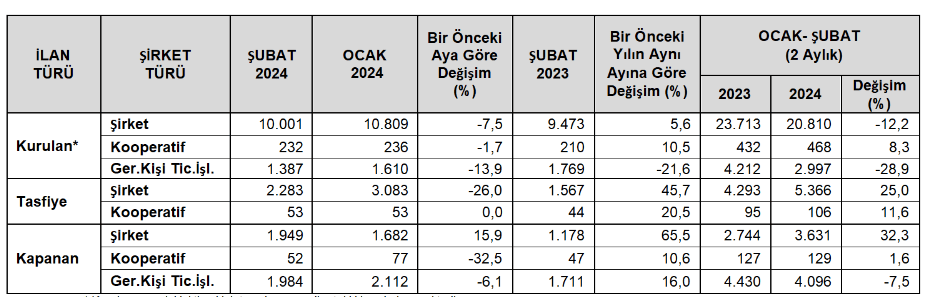 TOBB'a göre şubatta kapanan şirket sayısı geçen yıla göre yüzde 65,5 artışla 1,178, kurulan şirket sayısı ise yüzde 7,5 azalarak 10,001 oldu. Böylece ilk 2 ayda yüzde 32,2 artışla 3,631 şirket kapanırken, yüzde 12,2 düşüşle 20,810 şirket kuruldu.