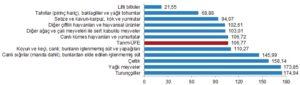 Sektörlerde bir önceki aya göre, tarım ve avcılık ürünleri ve ilgili hizmetlerde yüzde 1,64 artış, ormancılık ürünleri ve ilgili hizmetlerde yüzde 3,96 artış ve balık ve diğer balıkçılık ürünlerinde yüzde 6,72 artış gerçekleşti.