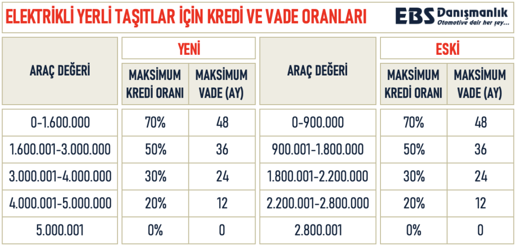 BDDK, nihai fatura değeri 1 milyon 600 bin TL ve altında olan yerli elektrikli otomobil kredilerinde taksit sayısını 48 ay, nihai fatura değeri 4 milyon TL’nin üzerinde olup 5 milyon TL’yi geçmeyen taşıt kredilerinde 12 ay olarak belirledi.
