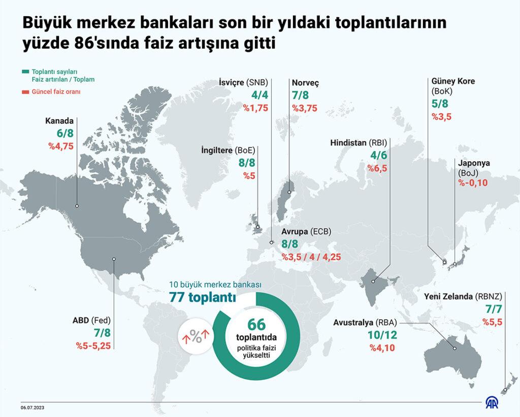 TCMB haziranda 21 Aralık 2021'den bu yana ilk kez politika faizini artırırken, ABD, Avrupa, Kanada ve Avustralya'nın da aralarında bulunduğu 10 büyük merkez bankası, son bir yıldaki toplantılarının yüzde 86'sında yüksek kalmaya devam eden enflasyona karşı faiz artışı silahını kullandı.