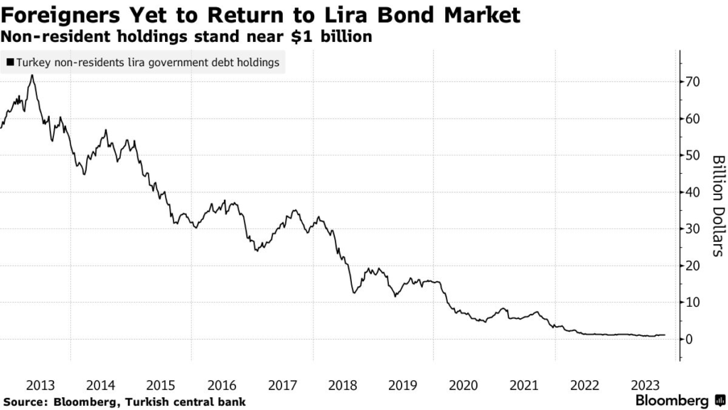 Bir zamanlar tahvillerde yaklaşık 70 milyar dolarlık sıcak para vardı. Bloomberg’in yazının girişinde sözünü ettiğim makalesinde yer verdiği grafik, bu paranın Türkiye’den nasıl kaçtığını gösteriyor, kaçan balık büyük oldu. (Grafiğin sağındaki dikey çizgi tahvillerdeki sıcak parayı milyar dolar cinsinden gösteriyor.)