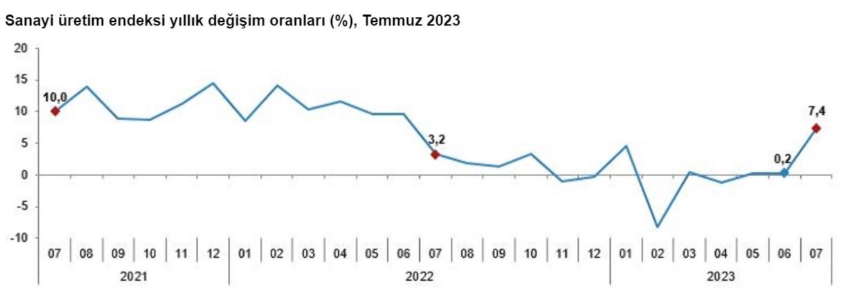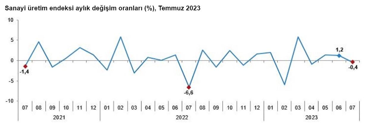 Sanayi Üretim Endeksi verilerine göre temmuz ayında sanayi üretimi mevsimsel etkilerden arındırılmış aylık yüzde 0,4 daraldı. Mayısta endeks bir önceki aya göre yüzde 1,4, haziranda ise yüzde 1,2 oranında artmıştı.
