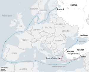 The Wall Street Journal’a göre Türkiye üzerinden geçen Rus petrol trafiğinin iki rotası.