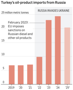 Türkiye, dizel ve akaryakıt gibi Rus petrol ürünlerinin en büyük alıcısı ve Çin ile Hindistan’dan sonra Rus ham petrolünün en büyük akıcılarından biri. Başkan Trump, Türkiye ve Çin’den ticareti durdurmalarını istedi ve satın alımları sürdürdüğü için Hindistan’a ek gümrük vergileri koydu.