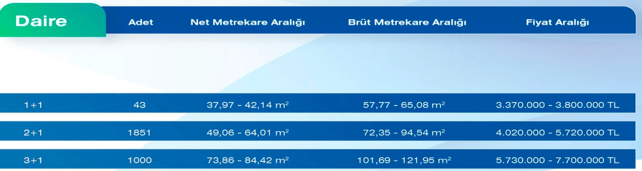 Projedeki yeni fiyatlar şöyle: