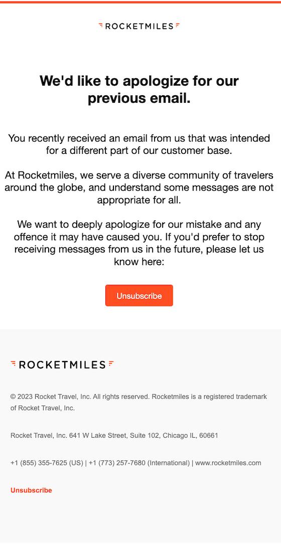 9 Haziran 16.05, Rocketmiles’tan gelen özür maili.
