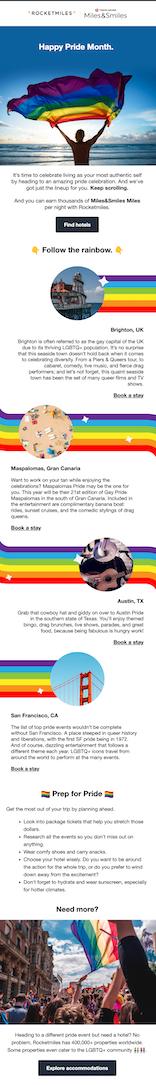 Rocketmiles, önce 8 Haziran’da Türkiye saatiyle 22.53’te, ‘🏳️🌈 Pride yolculuk: En iyi LGBTİ+ seyahat noktalarımız’ konulu bir mail gönderdi.