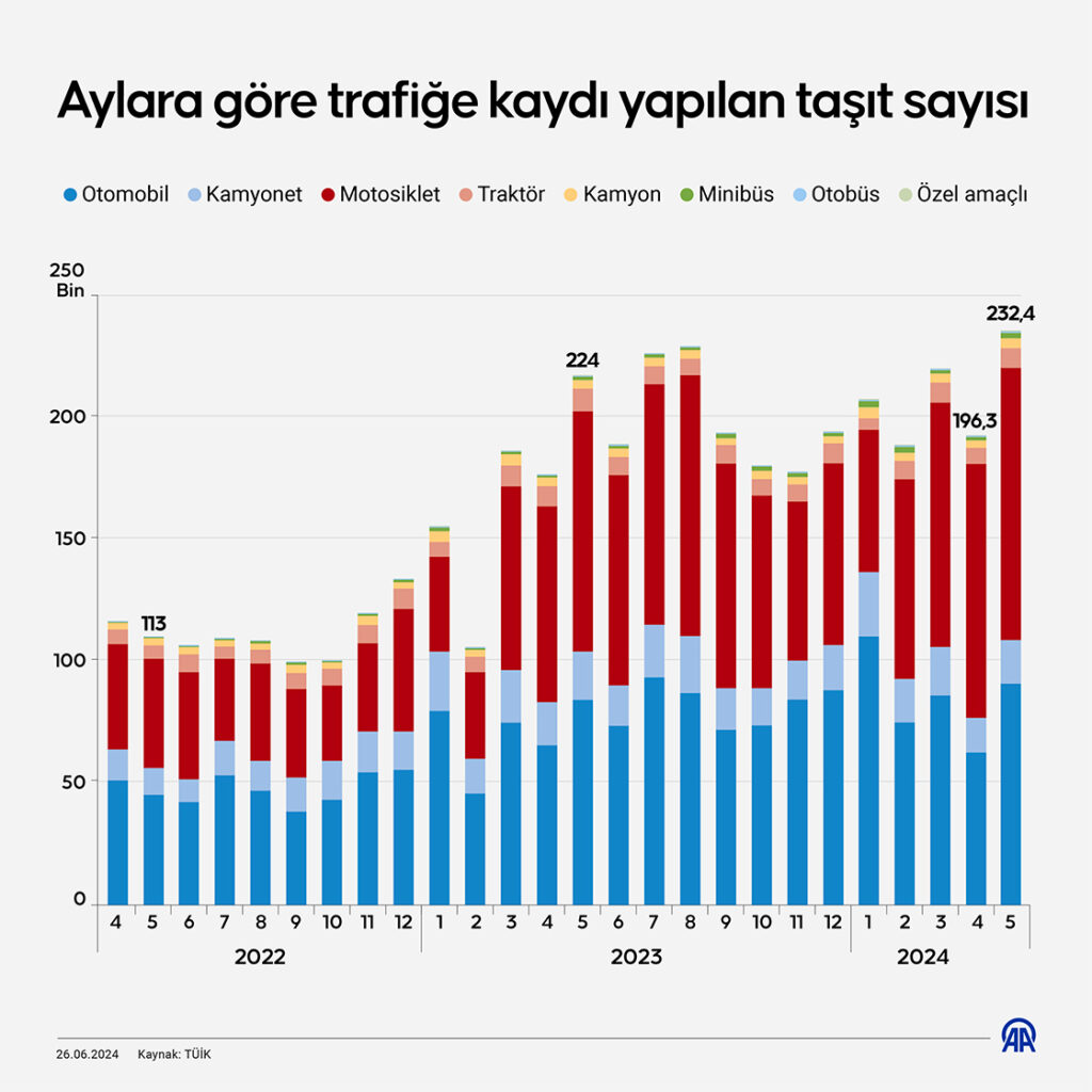 Trafikte elektrikli ve hibrit otomobillerin payı hızla artarken, dizel ve benzinlilerin payı azalıyor. Türkiye İstatistik Kurumu (TÜİK) motorlu kara taşıtları mayıs ayı istatistiklerini açıkladı. Mayıs ayında 232 bin 401 adet taşıtın trafiğe kaydı yapıldı. 2024’ün ilk beş ayındaki toplam kayıt sayısı ise 1 milyon 62 bin 420 oldu.