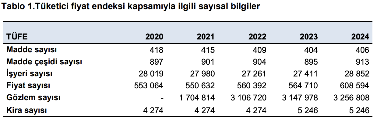 Madde tanımları ve yapısı gereği web scraping ile fiyat derlenmesi uygun olan beyaz eşya, elektronik ürünler, giyim, mobilya, sıfır otomobil ve otobüs bileti fiyatları için ilk kez 2022 yılında internet üzerinden derlenen fiyatlar endeks hesaplamalarında kullanılmış. 2024 yılı itibariyle bu yöntemle elde edilen fiyat sayısı toplam fiyat sayısının yaklaşık olarak yüzde 5,1’ini oluşturuyor. İnternet üzerinden web scraping yöntemi ile derlenen fiyatlardan ilgili ayın 1’i ile 24’ü arasında olan kısmı hesaplamalarda kullanılıyor.