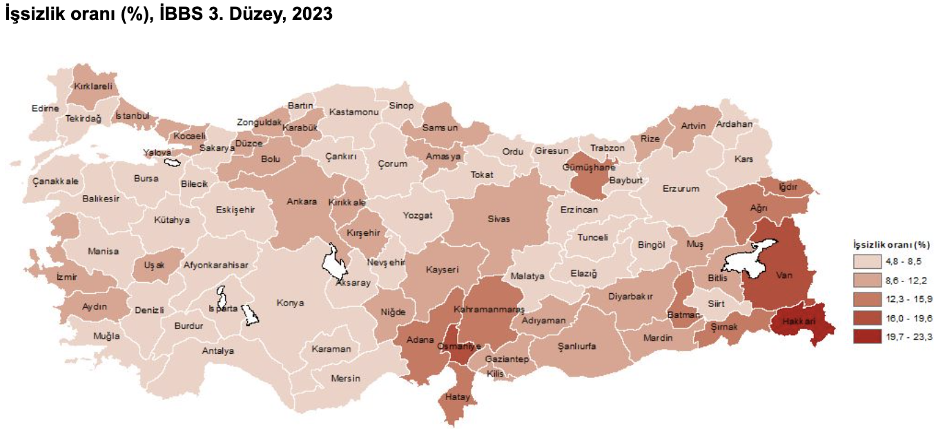 Türkiye'nin geçen yıl işsizlik oranı en yüksek ili yüzde 23,3 ile Hakkari iken işsizlik oranı en düşük il yüzde 4,8 ile Sinop oldu. İstanbul'da ise işsizlik genel ortalamanın 0,5 puan altında yüzde 8,9 olarak gerçekleşti.