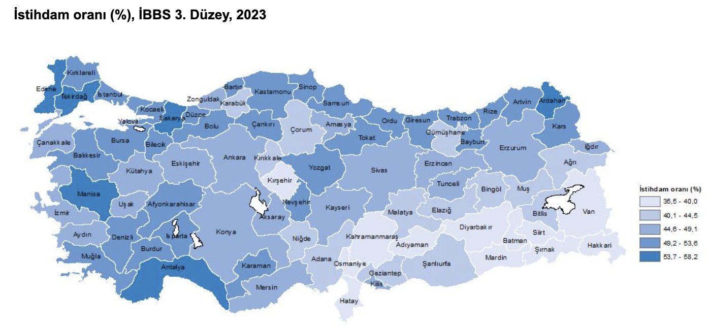 Türkiye genelinde 2023 yılı için istihdam oranı yüzde 48,3 olarak tahmin edildi. En yüksek istihdam oranı yüzde 58,2 ile Ardahan ilinde gerçekleşti. En düşük istihdam oranı ise yüzde 35,5 ile Siirt ilinde oldu. İstanbul’da istihdam oranı yüzde 51,9 olarak tahmin edildi.