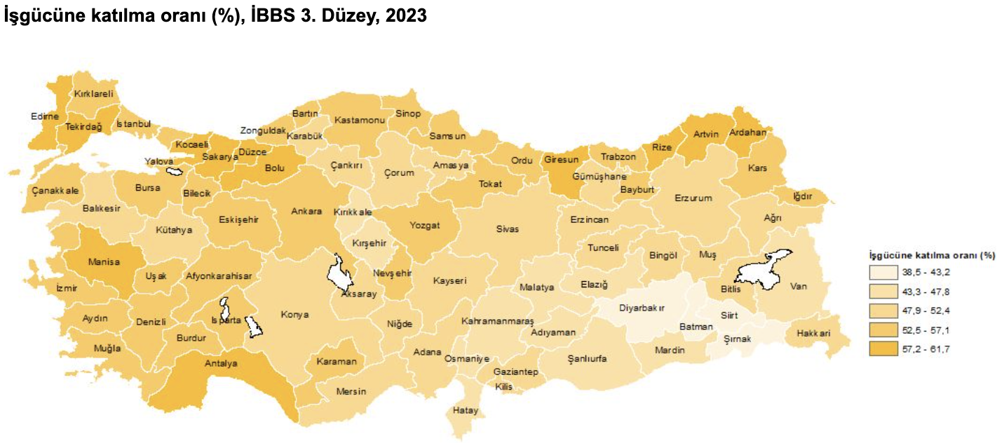 İstihdam edilenler ve işsizlerin çalışabilir yaştaki (kurumsal olmayan) nüfusa oranı olarak tanımlanan işgücüne katılım oranı Türkiye genelinde 2023 yılı için yüzde 53,3 olarak tahmin edildi. En yüksek işgücüne katılma oranı yüzde 61,7 ile ekonomisi tarım ve hayvancılığa dayalı Ardahan ilinde oldu. En düşük işgücüne katılma oranı ise yüzde 38,5 ile Siirt ilinde.