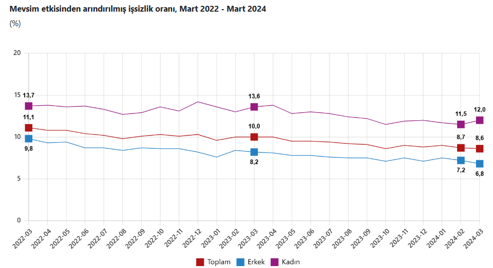 TÜİK'e göre 15-24 yaş grubunu kapsayan genç nüfusta işsizlik oranı bir önceki aya göre 0,4 puan azalarak yüzde 15,1 oldu. Türkiye İstatistik Kurumu’na (TÜİK) göre aralık ayında gerilemeye başlayan işsizlik oranındaki düşüş mart ayında da devam etti. Hanehalkı İşgücü Araştırması sonuçlarına göre, işsizlik oranı 0,1 puan azalarak yüzde 8,6 seviyesinde gerçekleşti. İşsizlik şubat ayında 0,3 puan düşerek yüzde 8,7 olmuştu. İşsizlik oranı erkeklerde yüzde 6,8 iken kadınlarda yüzde 12 olarak tahmin edildi. 15 ve daha yukarı yaştaki kişilerde işsiz sayısı mart ayında şubat ayına göre 19 bin kişi azalarak 3 milyon 57 bin kişi oldu.