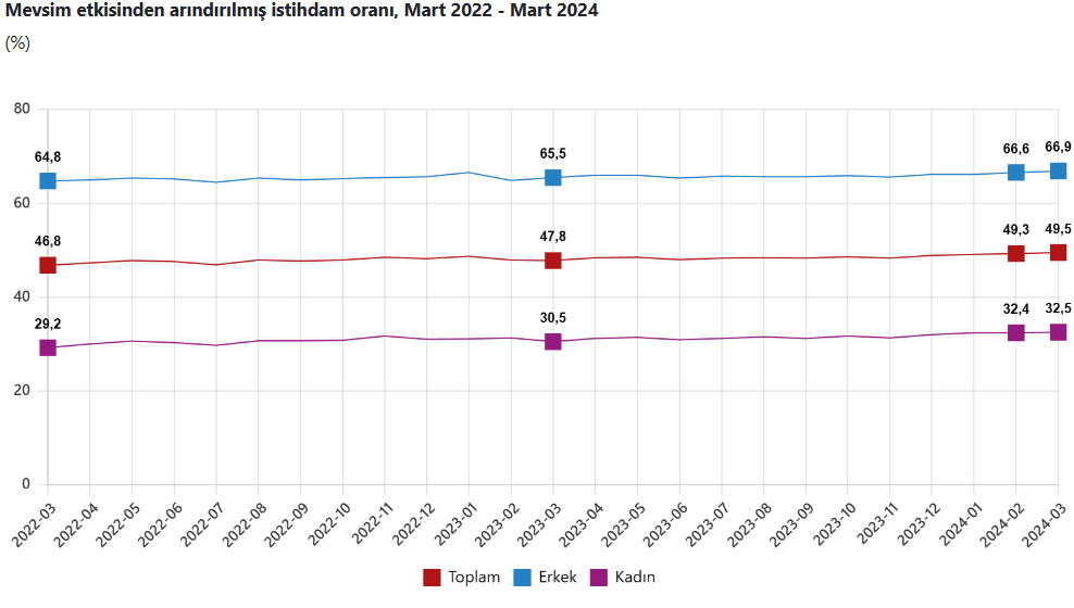 İstihdam edilenlerin sayısı mart ayında bir önceki aya göre 139 bin kişi artarak 32 milyon 588 bin kişi, istihdam oranı ise 0,2 puan artarak yüzde 49,5 oldu. Bu oran erkeklerde yüzde 66,9 iken kadınlarda yüzde 32,5 olarak gerçekleşti. İşgücü mart ayında bir önceki aya göre 121 bin kişi artarak 35 milyon 645 bin kişi, işgücüne katılma oranı ise 0,2 puan artarak yüzde 54,2 olarak gerçekleşti. İşgücüne katılma oranı erkeklerde yüzde 71,8 iken kadınlarda yüzde 36,9 oldu.