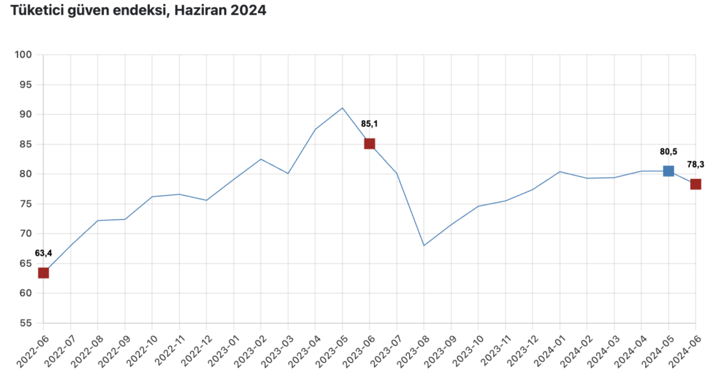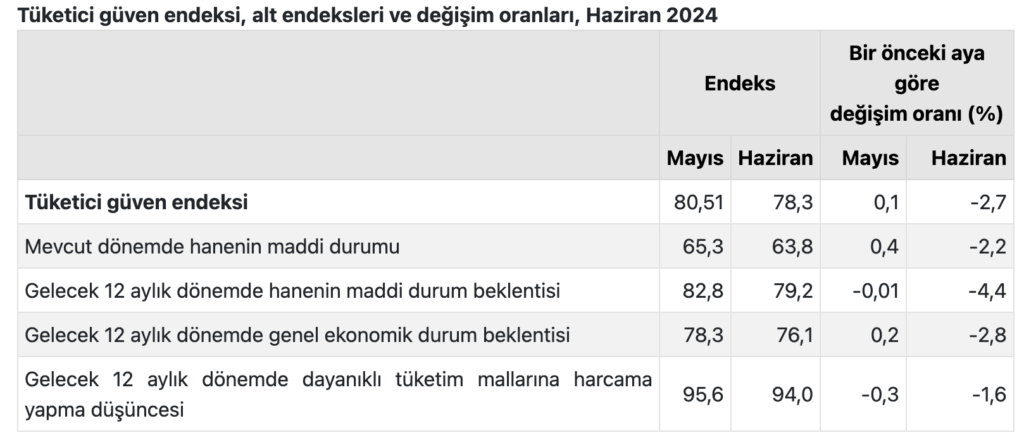 Haziran ayı verisi vatandaşın geleceğe yönelik genel ekonomik durum ile ilgili beklentisinin de ciddi şekilde bozulduğunu gösteriyor Türkiye İstatistik Kurumu (TÜİK) ve Türkiye Cumhuriyet Merkez Bankası işbirliğiyle yürütülen tüketici eğilim anketi sonuçlarından hesaplanan tüketici güven endeksi vatandaşın haziran ayında mevcut ekonomik duruma bakışı ve yarınla ilgili beklentilerinin mayıs ayı enflasyonunun zirve yaptığının ortaya çıkmasından sonra haziran ayında önemli oranda bozulduğunu gösterdi. Tüketici güven endeksi mayıs ayında 80,51 iken haziran ayında yüzde 2,7’lik bir düşüşle 78,3 oldu.