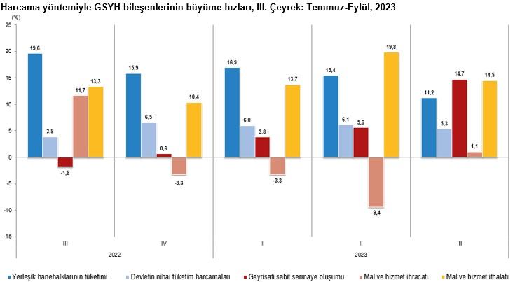 Yerleşik hane halklarının nihai tüketim harcamaları yılın üçüncü çeyreğinde bir önceki yılın aynı çeyreğine göre zincirlenmiş hacim endeksi olarak yüzde 11,2 arttı. İkinci çeyrekte artış yüzde 15,4 olmuştu. Üçüncü çeyrekte devletin nihai tüketim harcamaları yüzde 5,3, gayrisafi sabit sermaye oluşumu ise yüzde 14,7 arttı. İkinci çeyrekte devletin nihai tüketim harcamaları yüzde 6,1, gayrisafi sabit sermaye oluşumu ise yüzde 5,6 artmıştı.