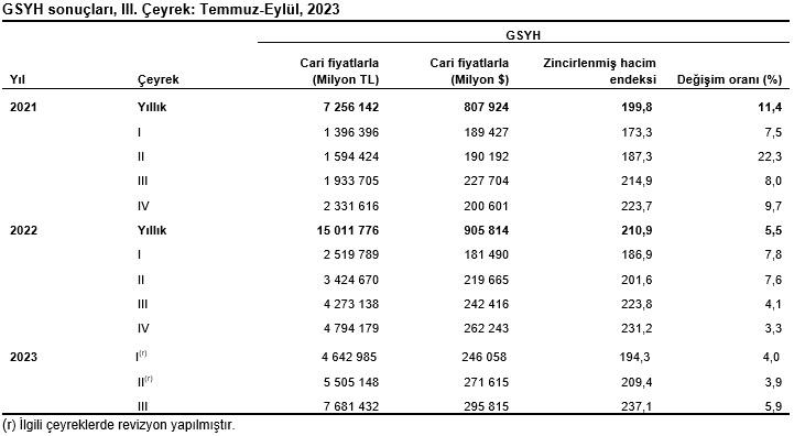 Üretim yöntemiyle GSYH tahmini, 2023 yılının üçüncü çeyreğinde cari fiyatlarla bir önceki yılın aynı çeyreğine göre yüzde 79,8 artarak 7 trilyon 681 milyar 432 milyon TL oldu. GSYH’nin üçüncü çeyrek değeri cari fiyatlarla dolar bazında 295 milyar 815 milyon olarak gerçekleşti.