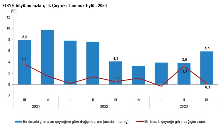 Mevsim ve takvim etkilerinden arındırılmış GSYH zincirlenmiş hacim endeksi, bir önceki çeyreğe göre yüzde 0,3 arttı. Takvim etkisinden arındırılmış GSYH zincirlenmiş hacim endeksi, 2023 yılı üçüncü çeyreğinde bir önceki yılın aynı çeyreğine göre yüzde 5,1 arttı.