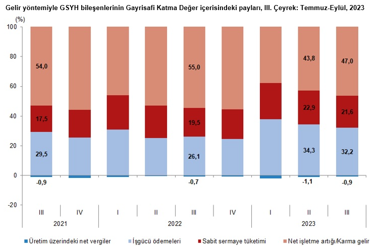 İşgücü ödemeleri, 2023 yılının üçüncü çeyreğinde bir önceki yılın aynı çeyreğine göre yüzde 117,2 arttı. Net işletme artığı/karma gelir yüzde 50,7 arttı. İşgücü ödemelerinin cari fiyatlarla gayrisafi katma değer içerisindeki payı geçen yılın üçüncü çeyreğinde yüzde 26,1 iken, bu oran 2023 yılında yüzde 32,2 oldu. Net işletme artığı/karma gelirin payı ise yüzde 55,0 iken yüzde 47’ye indi.