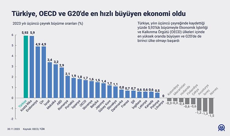 Nitekim Türkiye, 3. çeyrekte yüzde 5,9’luk büyüme verisiyle Ekonomik İşbirliği ve Kalkınma Örgütü (OECD) ve G20 ülkeleri arasında en hızlı büyüyen ekonomi oldu. OECD’de Türkiye’yi, yüzde 5,9’luk büyüme oranıyla Kosta Rika takip etti. Bu ülkeyi yüzde 3,4 ile İsrail, yüzde 3,2 ile Meksika ve yüzde 2,9 ile ABD izledi. OECD ülkeleri ekonomilerinin ortalama büyümesi yüzde 1,7 olarak hesaplandı. OECD’de ekonomisi en çok küçülen ülke ise yüzde 1,5 ile Norveç oldu. Ekonomisi en fazla daralan ikinci ülke yüzde 1,3 ile İsveç olarak hesaplandı.