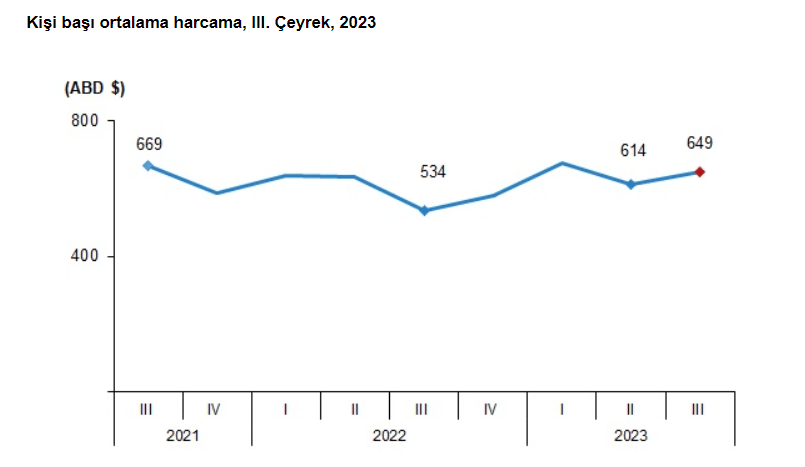Diğer yandan pasaport almada yaşanan sıkıntılara rağmen Türk vatandaşlarının yurt dışına çıkışları da artmaya devam ediyor. 2’nci çeyrekte yurtdışına çıkış oranları yüzde 72.7 artarken, bu artış oranı 3’üncü çeyrekte geçen yılın aynı çeyreğine göre yüzde 43,7 artarak 2 milyon 978 bin 418 kişi oldu. Bunların kişi başı ortalama harcaması 649 dolar olarak gerçekleşti.