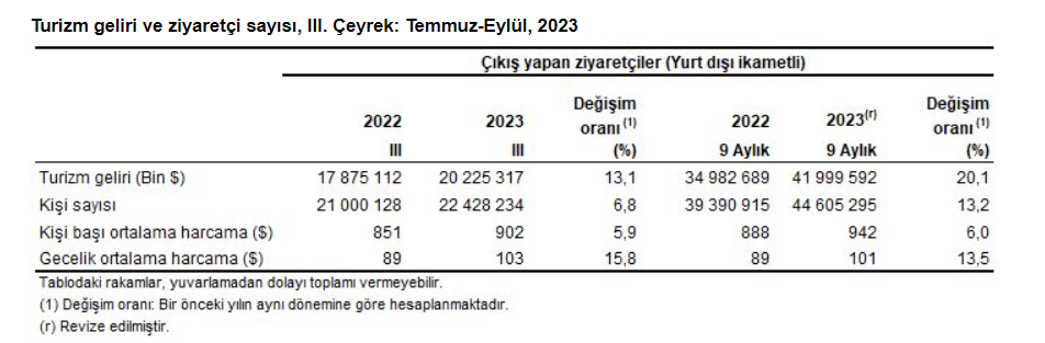 Turizm verilerini değerlendiren Kültür ve Turizm Bakanı Mehmet Nuri Ersoy, “Verilere göre 2023 yılı ilk 9 aylık dönemde turizm gelirleri geçen senenin aynı dönemine göre yüzde 20,1 artışla 42 milyar dolara, ziyaretçi sayıları aynı dönemde yüzde 12.4 artışla 45,2 milyona ulaştı” . Bakan Ersoy, turizm gelirlerinde OVP hedefi olan 55,6 milyar dolara doğru uygun şekilde ilerlediklerini kaydetti.