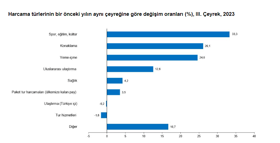 Söz konusu dönemde spor, eğitim, kültür harcaması yüzde 33,3, konaklama harcaması yüzde 26,1, yeme-içme harcaması yüzde 24,6 artarken, tur hizmetleri harcaması yüzde 1,6 azaldı.