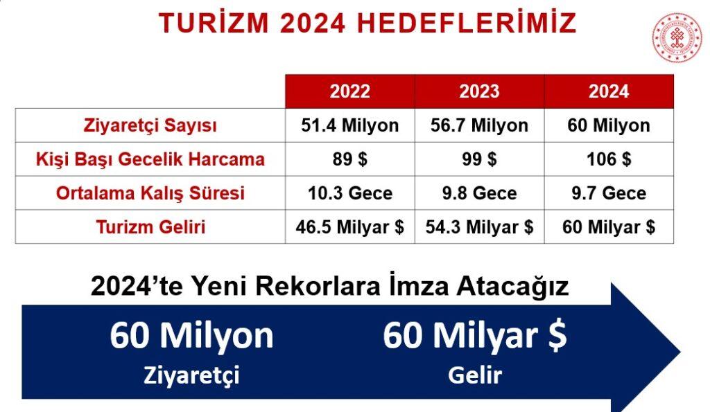 Turizm gelirlerinin 2023’te 54,3 milyar dolara yükseldiğini anlatan Ersoy “Yani 56,7 milyon ziyaretçi, 99 dolar kişi başı gecelik gelir ve 54,3 milyar dolar toplam gelir ile 2023 turizmde rekor yıl oldu diyebiliriz” dedi. Turizmde 2024 hedeflerine de değinen Ersoy “2022’de pandemi öncesi rakamlarla 51,4 milyona gelmişti, geçen yıl 56,7 milyonla ziyaretçi rekoru kırıldı, bu sene 60 milyon ziyaretçi hedefliyoruz. Yine bizim için öncelikli olan kişi başı gecelik harcamalarda 2022’de 89 dolar, geçen yıl 99 dolar gibi bir rekor elde etmiştik, burada da stratejimize, gelirleri artıran politikamıza uygun olarak 106 dolarlık kişi başı gecelik gelir bekliyoruz. Ortalama kalış süreleri pandeminin de etkisiyle 10,3’tü, 2023’te 9,8 pandemi öncesi rakamlara döndük. Yurt dışı yerleşikliklerin pasta payının azalması ve ürün çeşitliliğiyle sezonun 12 aya yayılmasının da etkisiyle bir parça daha aşağı geleceğini öngörüyoruz; 9,7 ortalama gecelemeyle 2024 yılını tamamlamayı hedefliyoruz. Gelir olarak baktığımızda ise 46,5 milyar dolarlık 2022 rekorunu bu sene 54,3 milyar dolarla tazeledik. Bu sene yeni bir rekorla 60 milyar dolar gelir hedefliyoruz” diye konuştu.