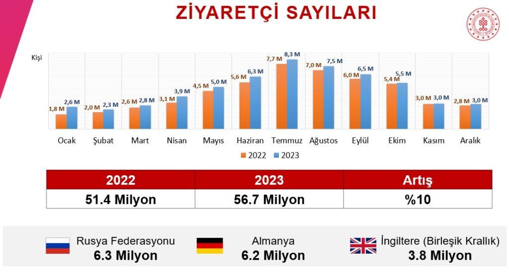 2022'de 51,4 milyon olan ziyaretçi sayısı yüzde 10 artışla 2023'te 56,7 milyona yükselirken bu yılki hedef 60 milyon olarak belirlendi. Kültür ve Turizm Bakanı Mehmet Ersoy turizmde geçen yıl sonuçlarını ve bu yılki hedefleri Atatürk Kültür Merkezi’nde (AKM) düzenlediği toplantıyla anlattı. 2022’nin pandemiden çıkış yapılan çok önemli bir yıl olduğunu belirten Ersoy “Türkiye pandemi sürecini çok iyi yönettiği için 2022’de turizm sektörü olarak da çok ciddi sıçramalar yakaladığımız, çok başarılı geçirdiğimiz bir sezon oldu. Hatta sektörel bazda baktığımızda dünyada pandemi öncesi rakamları ilk yakalayan ülkeler arasında Türkiye gelmişti” dedi.