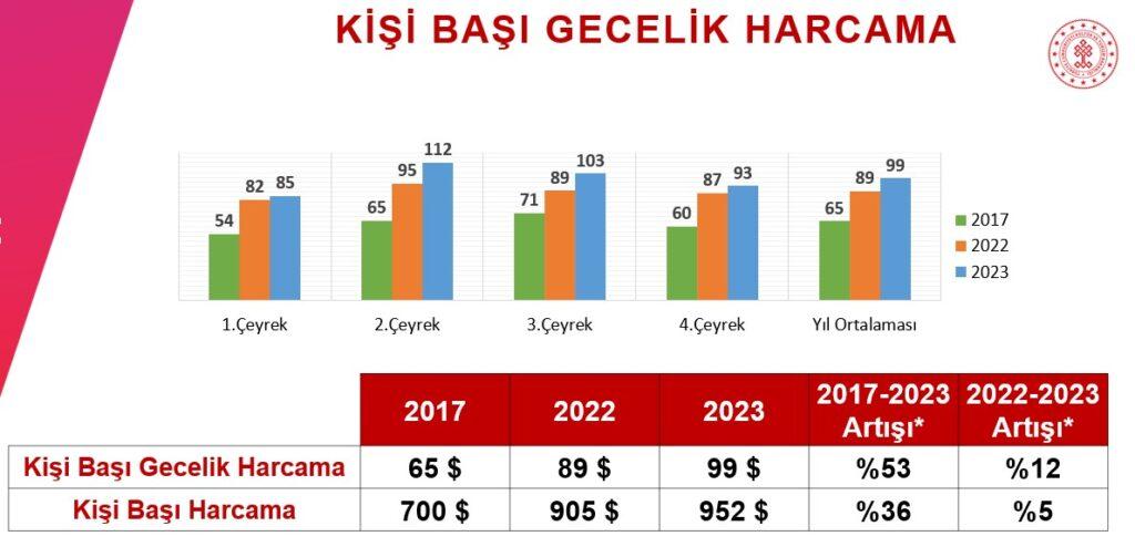 Ersoy kişi başı gecelik harcamaların 2017 ile 2023 arasında yüzde 53 artışla 65 dolardan 99 dolara yükseldiğini, kişi başı harcamanın yüzde 36 artışla 700 dolardan 952 dolara çıktığını, kişi başı gelir değil de kişi başı gecelik gelire endekslenmenin önemini vurguladı.