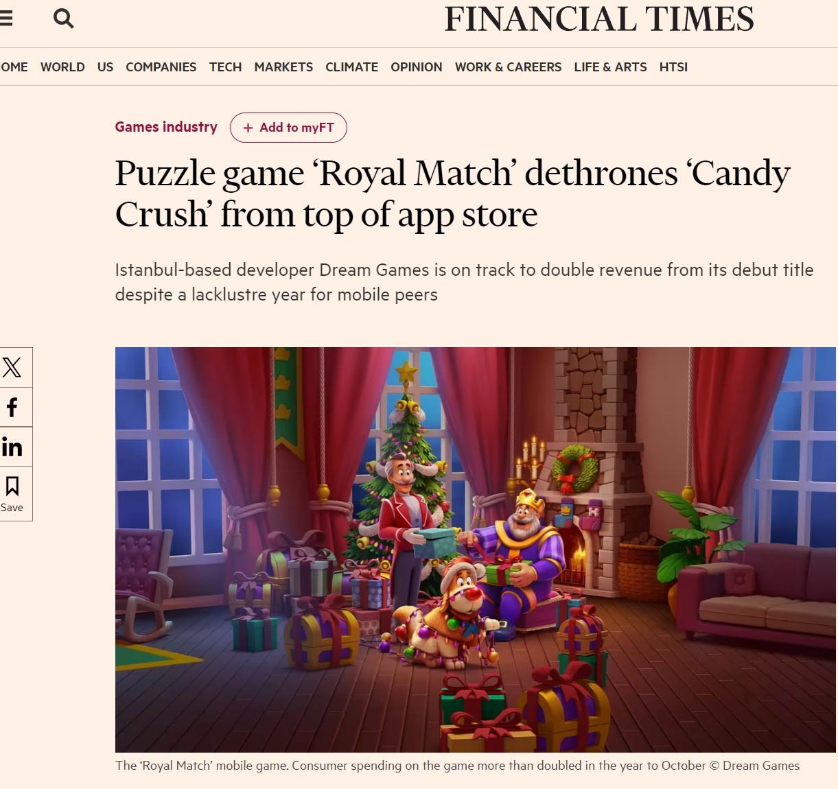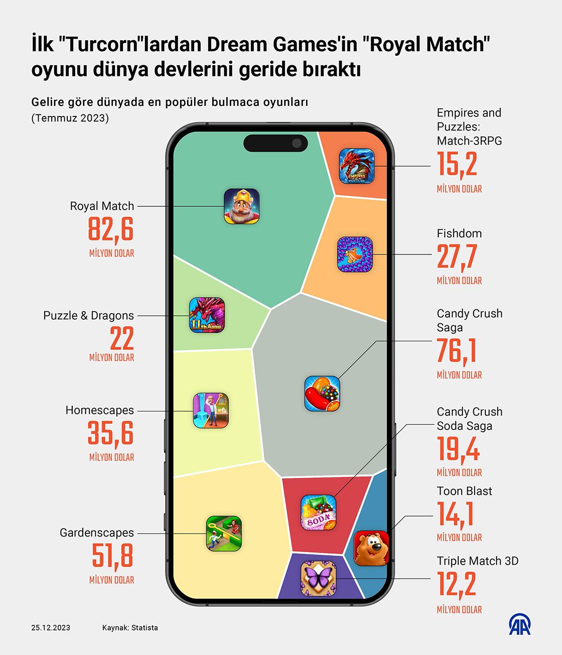 Royal Match tüm dünyada en çok indirilen ve 10 yıldır zirvede olan 76,13 milyon dolarlık Candy Crush Saga’yı böylece tahtından indirdi. Bunları Playrix’in 51,78 milyon dolarlık Gardenscapes, 35,56 milyon dolarlık Homescapes ve 27,67 milyon dolarlık Fishdom oyunları takip etti. Listenin 6. sırasında GungHo’nun 22,02 milyon dolarlık Puzzle and Dragons oyunu yer aldı. Candy Crush Soda Saga ise 19,38 milyon dolarla yedinci sırada geldi. Empires and Puzzles: Match-3RPG 15,23 milyon dolarla listenin 8’inci sırasında Triple Match 3D ise 12,2 milyon dolarla 10. sırasında yer buldu. İlk yerli unicorn olan ve 2020’de hisselerini ABD’li Zynga’ya satan Peak Games’in “Toon Blast” oyununun ise 14,12 milyon dolarla listenin 9. sırasında yer aldığı görüldü.