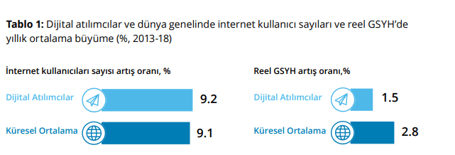 bir yıllık büyümeye sahipken (dünya genelinde %9.1 iken dijital atılımcılarda %9.2), ekonomik büyüme hızları dünya genelinin oldukça gerisinde kalıyor (dünya genelinde %2.8 iken dijital atılımcılarda %1.5). Çalışmada söz konusu dijital atılımcılarda, dijital dönüşümün sağladığı potansiyel verimlilik artışlarından yeterince yararlanılamadığı ve uygun politikalarla söz konusu 16 ülkede toplam 3.4 trilyon dolarlık (Türkiye özelinde ise
