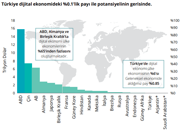Türkiye, küresel dijital ekonomiden aldığı binde 1 payla, geleneksel ekonomide küresel GSYH içinden aldığı binde 85’lik payın ancak 7'de 1'ini alabiliyor. Gelişmiş ülkelerde dijital ekonomi toplam GSYH'nin en az yüzde 65'ini oluştururken Türkiye'de bu oran sadece yüzde 6.
