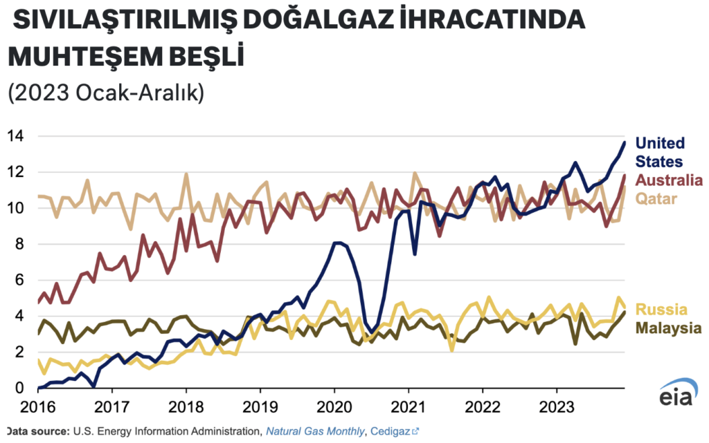 Türkiye’nin de anlaşma imzaladığı ABD 2023 yılı sonu itibariyle dünyanın en çok LNG üreten ve ihraç eden ülkesi. ABD’yi Avustralya ve Katar izliyor. Sıvılaştırma işlemi daha önce boru hatlarıyla taşımacılığın getirdiği kısıtlamalar nedeniyle bugüne göre çok daha az miktarda ihraç edilebiliyordu. ABD’nin en büyük pazarı Avrupa ülkeleri. Avustralya ise neredeyse tüm LNG’yi Asya’daki müşterilerine gönderiyor. Katar da Asya’nın yanı sıra İngiltere, Belçika ve İtalya gibi Avrupa ülkelerine bir miktar LNG tedarik ediyor. Cezayir gibi ülkeler de Avrupa’ya LNG ihraç ediyor.