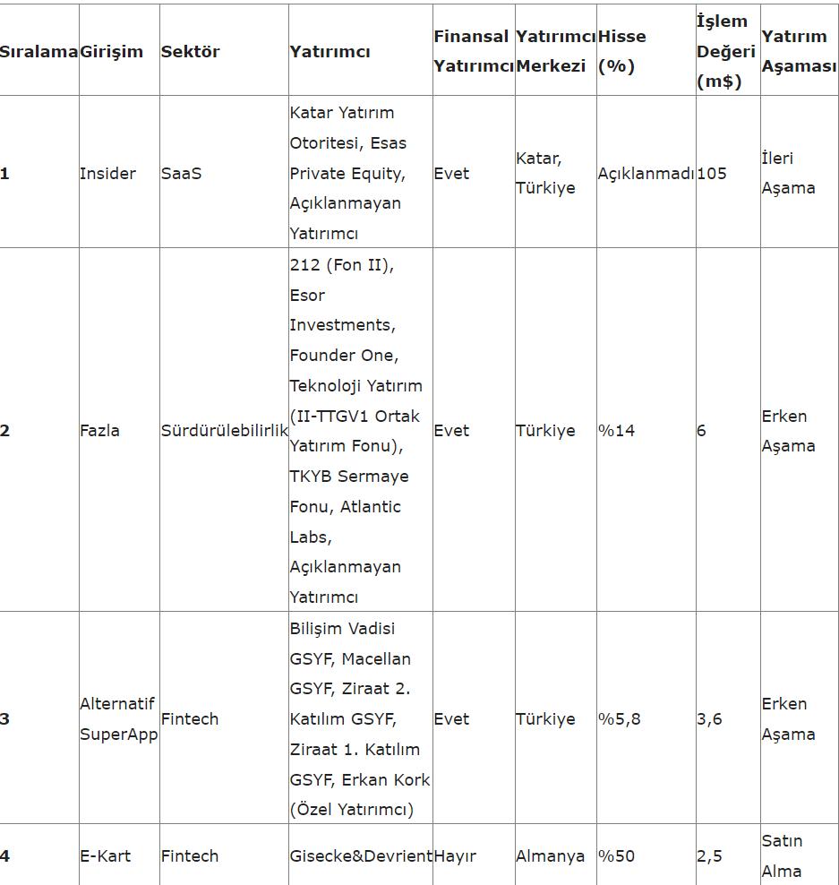 Yabancı yatırımcılar toplam işlem hacminin yüzde 75’ini oluşturarak en büyük paya sahip olurken yerel yatırımcıların payı yüzde 25 olarak gerçekleşti. İşlem sayısı bakımından ise yerli yatırımcılar 67 işlemle yabancı yatırımcıları geride bıraktı. Türkiye merkezli yazılım şirketi Insider’ın, Katar Yatırım Otoritesi ve Esas Holding’in Girişim Sermayesi önderliğinde almış olduğu 105 milyon dolarlık ileri aşama yatırım, yılın ikinci çeyreğinin en büyük işlemi oldu.