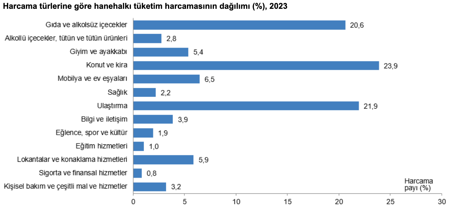 2022'de yüzde 22,8 ile gıda ve alkolsüz içecekler önde iken, 2023'de ise en yüksek pay yüzde 23,9 ile konut ve kiraya gitti. Türkiye İstatistik Kurumu (TÜİK) Hanehalkı Bütçe Araştırması’nın 2023 yılı sonuçlarına göre Türkiye genelinde hanehalklarının tüketim amaçlı yaptığı harcamalar içinde en yüksek payı yüzde 25’lik kira sınırlamasının bekleneni vermemesi ve düşük faiz nedeniyle yatırım araçları içinde öne çıkan konuttaki fiyat artışları sonucu yüzde 23,9 ile konut ve kira harcamaları alırken, ikinci sırayı yüzde 21,9 ile ulaştırma harcamaları, üçüncü sırayı ise yüzde 20,6 ile gıda ve alkolsüz içecek harcamaları aldı.