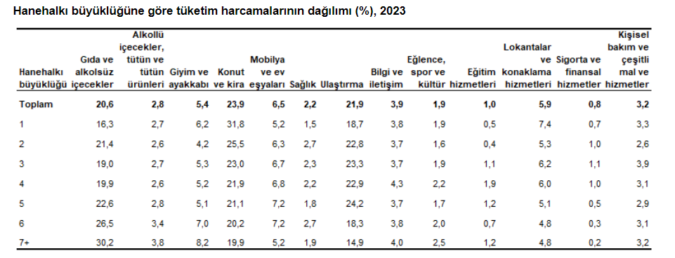 Hanehalkı büyüklüğüne göre tüketim harcamalarının 2023 yılındaki dağılımına bakıldığında; tek kişilik hanehalkları, konut ve kira harcamalarına yüzde 31,8, ulaştırma harcamalarına yüzde 18,7 ve gıda ve alkolsüz içecek harcamalarına yüzde 16,3 pay ayırdı. Hanehalkı büyüklüğü 7 ve daha fazla kişi olan hanehalkları, gıda ve alkolsüz içecek harcamalarına yüzde 30,2, konut ve kira harcamalarına yüzde 19,9 ve ulaştırma harcamalarına yüzde 14,9 pay ayırdı.