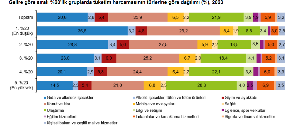 2022’de en düşük gelir grubu olan birinci yüzde 20’lik grupta yer alan hanehalkları, gıda ve alkolsüz içecek harcamalarına yüzde 35,8, konut ve kira harcamalarına yüzde 29,3, ulaştırma harcamalarına yüzde 8,3 ve mobilya ve ev eşyası harcamalarına yüzde 5,5 pay ayırmıştı. İki yılın verisinin karşılaştırması en düşük gelirli grubun gıda ve alkolsüz içecek harcamalarının toplam harcamaları içindeki payının arttığını gösteriyor.