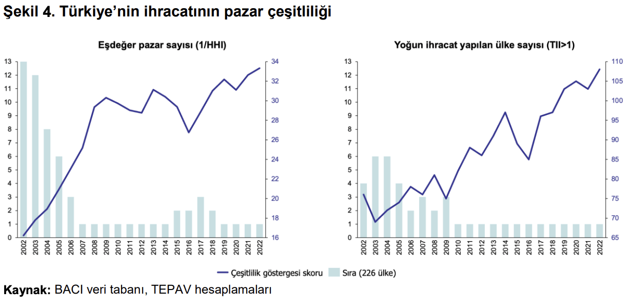 TEPAV’a göre Türkiye ihracatta ürün çeşitliliğinde dünyanın en öndeki altı ekonomisinden biri, pazar çeşitliliği açısındansa dünyada lider ülke olarak öne çıkıyor. Ancak Doğu ve Güney Asya ve Güney Amerika gibi bölgelere daha fazla nüfuz etmesi şart.